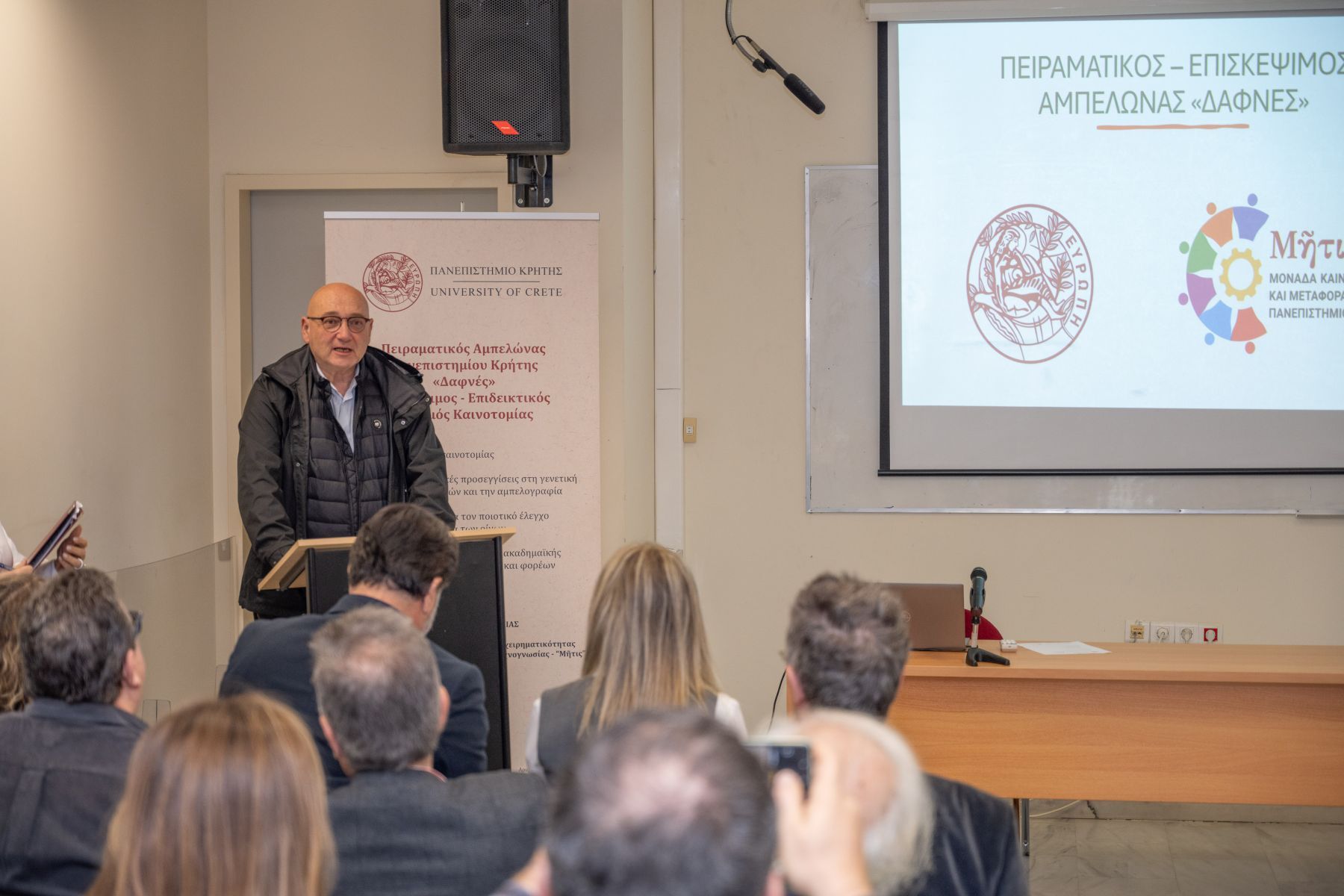 Ακολούθησε η παρουσίαση του Πειραματικού - Επισκέψιμου Αμπελώνα “Δαφνές” από τον Στέφανο Κουνδουρά, καθηγητή Αμπελουργίας, Διευθυντή του Εργαστηρίου Αμπελουργίας του Τμήματος Γεωπονίας του Α.Π.Θ, ο οποίος ανέδειξε τη σημασία των αμπελογραφικών συλλογών για τη διατήρηση της γενετικής ποικιλότητας της αμπέλου, ιδιαίτερα υπό το πρίσμα της κλιματικής αλλαγής και της αναδιάρθρωσης των καλλιεργειών. Χαρακτήρισε τον αμπελώνα του Πανεπιστημίου Κρήτης ως “θεματοφύλακα της βιοποικιλότητας της αμπέλου στο νησί” και τόνισε τον ρόλο των συλλογών ως ζωντανών εργαστηρίων εκπαίδευσης για φοιτητές και ερευνητές.