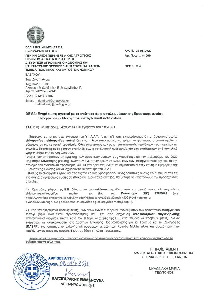 Πλέον οποιαδήποτε συγκέντρωση στο ελαιόλαδο σε Chlorpyriphos μπορεί να οδηγήσει σε ανάκληση του προϊόντος από την αγορά και βαριά πρόστιμα σε όλη την αλυσίδα παραγωγής.