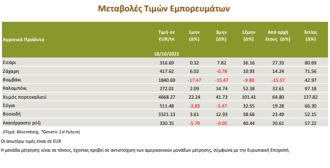 Στα αγροτικά προϊόντα, απώλειες σημείωσαν η τιμή του βαμβακιού, του ρυζιού και της σόγιας, κέρδη κατέγραψαν οι τιμές του χυμού πορτοκαλιού, της ζάχαρης, των βοοειδών και του καλαμποκιού, ενώ οριακά ενισχύθηκε η τιμή του σιταριού. Οι ανησυχίες για πιθανή κλιμάκωση του Ρωσο-ουκρανικού πολέμου, καθώς αναμένεται επανεξέταση της συμφωνίας εξαγωγής των ουκρανικών σιτηρών στα μέσα Νοεμβρίου σε συνδυασμό με τις καιρικές συνθήκες αναμένεται να ενισχύσουν περαιτέρω τις τιμές στα σιτηρά (σιτάρι, καλαμπόκι), παρά τη μειωμένη ζήτηση από την Κίνα και τον περιορισμό των αμερικανικών εξαγωγών, λόγω του ακριβού δολαρίου. Για τη ζάχαρη, τα στοιχεία για τη μειωμένη βραζιλιάνικη παραγωγή πιθανά να συνεχίσουν να ευνοούν την τιμή της. Η επικείμενη οικονομική επιβράδυνση δύναται να περιορίσει τη ζήτηση βαμβακιού, θέτοντας σε περαιτέρω πτωτική πορεία την τιμή του. Για τον χυμό πορτοκαλιού, η μειωμένη παραγωγή στις ΗΠΑ και οι εξαγωγές από τη Βραζιλία προβλέπεται να ενισχύσουν την τιμή του. Αν και οι τιμές των βοοειδών, βρίσκονται σε υψηλό πολλών ετών, ο περιορισμός των θέσεων αγοράς, πιθανά να προμηνύει εμφάνιση πτωτικών πιέσεων βραχυπρόθεσμα. Για το ρύζι, οι περιορισμένες προμήθειες, καθώς και οι σχετικά υπερβολικές βροχοπτώσεις την περίοδο των μουσώνων τον Οκτώβριο, πλήττοντας την υφιστάμενη περίοδο συγκομιδής ρυζιού, δύναται να ενισχύσουν περαιτέρω την τιμή του.