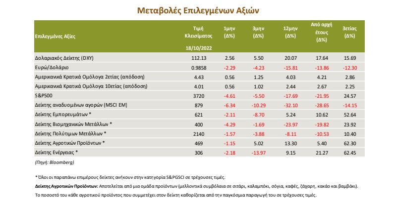 Η πορεία του πληθωρισμού σε ΗΠΑ και Ευρώπη ενισχύουν τις πιθανότητες για αύξηση του επιτοκίου κατά 75 μονάδες βάσης από τη Fed και την ΕΚΤ. Το ενδιαφέρον επικεντρώθηκε στις γεωπολιτικές ανησυχίες στην Ευρώπη, στις εξελίξεις στη Μ. Βρετανία -με το πρόγραμμα δημοσιονομικής στήριξης που ακυρώθηκε, καθώς και στην ανακοίνωση των εταιρικών αποτελεσμάτων στις ΗΠΑ που υπερβαίνουν, μέχρι στιγμής, τις εκτιμήσεις της αγοράς. Το ισχυρό δολάριο, με την καλύτερη μακροοικονομική εικόνα των ΗΠΑ και των δηλώσεων αξιωματούχων της Fed που διατήρησαν την επιθετική ρητορική τους, έθεσε υπό πτωτική πίεση τις τιμές των εμπορευμάτων, χρυσού, πετρελαίου, βιομηχανικών μετάλλων και αγροτικών προϊόντων.