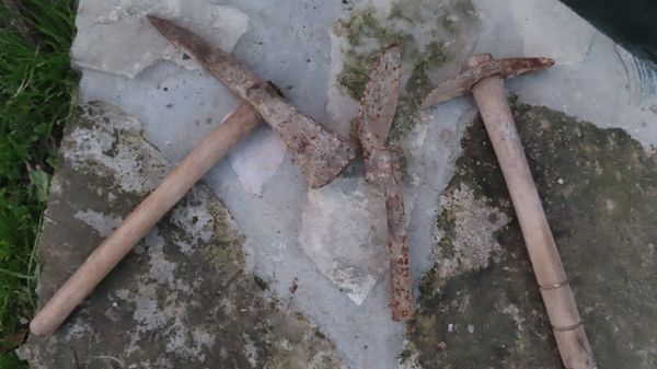 Καμιά φορά δούλευαν και δυο χτίστες, ο πιο καλός τεχνίτης έκανε τα δύσκολα και ο άλλος από πίσω έκανε τα γεμίσματα με χαλίκια και πηλό. Ο χτίστης χρησιμοποιεί ένα εργαλείο το λεγόμενο «μυστρί» από μασίφ σίδερο, που ήταν μικρότερο του σημερινού, και πολύ πιο βαρύ, για να σπάει επιτόπου τις μύτες από τις πέτρες. Το μιστρί αυτό το κατασκεύαζε ο χαρκιάς ή σιδεράς. Υπήρχαν βέβαια και τότε οι βιομηχανικοί «μαλάδες», που έμοιαζαν με τα κλασσικά γνωστά μας σημερινά μυστριά. Με τα εργαλεία λοιπόν το χτιριού μαζί με το ζύγι, θα ανυψώνει τον τοίχο.