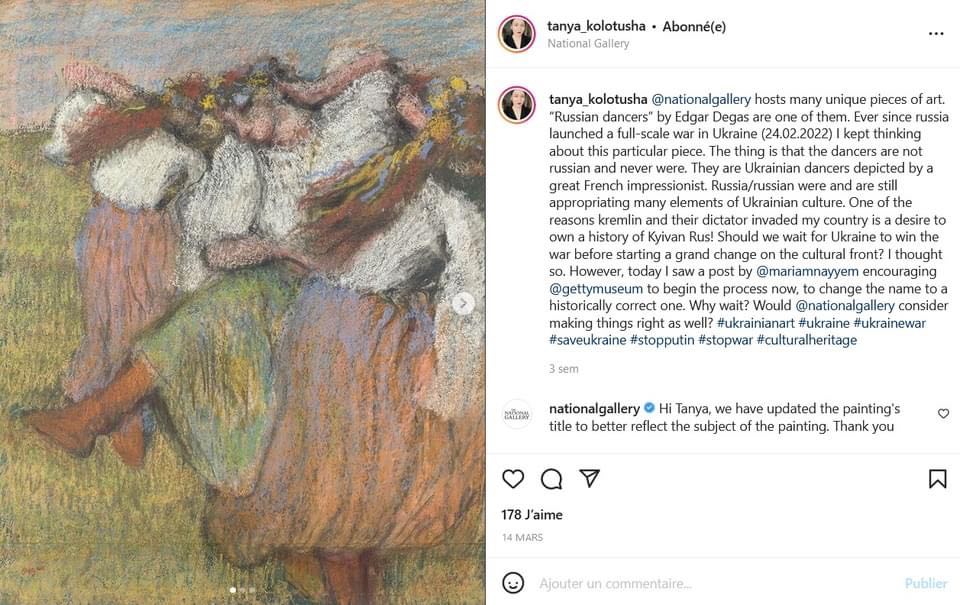 «Από τότε που η Ρωσία ξεκίνησε τον πόλεμο στην Ουκρανία, σκεφτόμουν μόνο αυτό το έργο. Γεγονός είναι ότι οι χορεύτριες δεν είναι Ρωσίδες και δεν ήταν ποτέ», έγραψε η Tanya Kolotusha, μια Ουκρανή που ζει στο Λονδίνο, στο Instagram στις 14 Μαρτίου, καλώντας το μουσείο να αλλάξει το όνομα του πίνακα.
