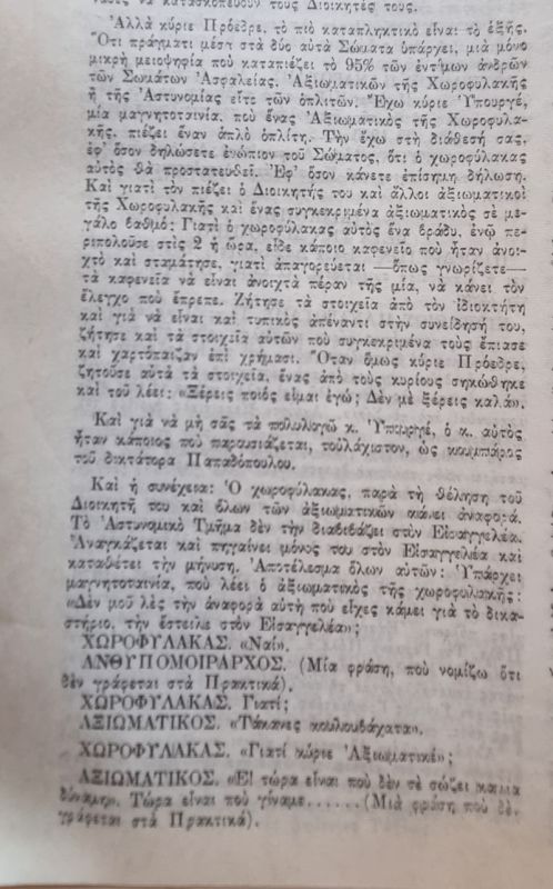 […] Αλλά κύριε Πρόεδρε, το πιο καταπληκτικό είναι το εξής. Ότι πράγματι μέσα στα δύο αυτά Σώματα [Χωροφυλακής και Αστυνομίας] υπάρχει, μια μόνο μικρή μειοψηφία που καταπιέζει το 95% των εντίμων ανδρών των Σωμάτων ασφαλείας. Αξιωματικών της Χωροφυλακής ή της Αστυνομίας είτε των οπλιτών. Έχω κύριε Υπουργέ μια μαγνητοταινία που ένας Αξιωματικός της Χωροφυλακής πιέζει ένα απλό οπλίτη. Την έχω στη διάθεσή σας εφ’ όσον δηλώσετε ενώπιον του Σώματος ότι ο χωροφύλακας αυτός θα προστατευθεί. Εφ’ όσον κάνετε επίσημη δήλωση.