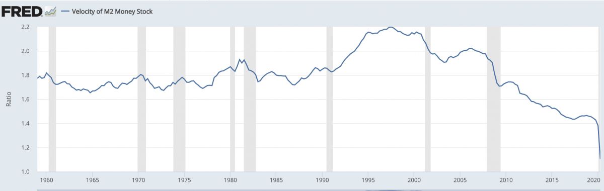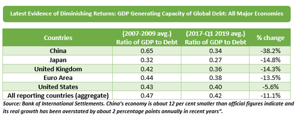 Το ΑΕΠ ισούται με το Χρήμα επί την Ταχύτητα Κυκλοφορίας του. Ετσι, επειδή η παραγωγικότητα του αυξανόμενου χρέους είναι όλο και μικρότερη, αυτό οδηγεί σε μείωση της ταχύτητας του χρήματος (σχήμα 2), που με τη σειρά της, καταστέλλει το ρυθμό αύξησης του ΑΕΠ…