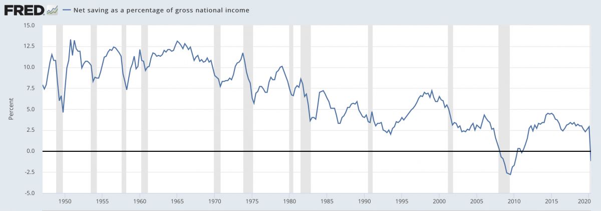 Εκεί όμως που η κατάσταση έχει ξεφύγει και οδηγεί το συνολικό μηχανισμό σε εκτροχιασμό, είναι σε κρατικό επίπεδο. Τα δημοσιονομικά πακέτα στήριξης, έχουν οδηγήσει σε αρνητικά επίπεδα αποταμίευσης που φτάνουν ποσοστά που ξεπερνούν το -18 % επι του Ακαθάριστου Εθνικού Εισοδήματος… Αυτό οδηγεί σε αρνητικό πρόσημο, το Καθαρό Εθνικό ποσοστό Αποταμίευσης, σε σχεση με το GNI. (σχήμα 1)