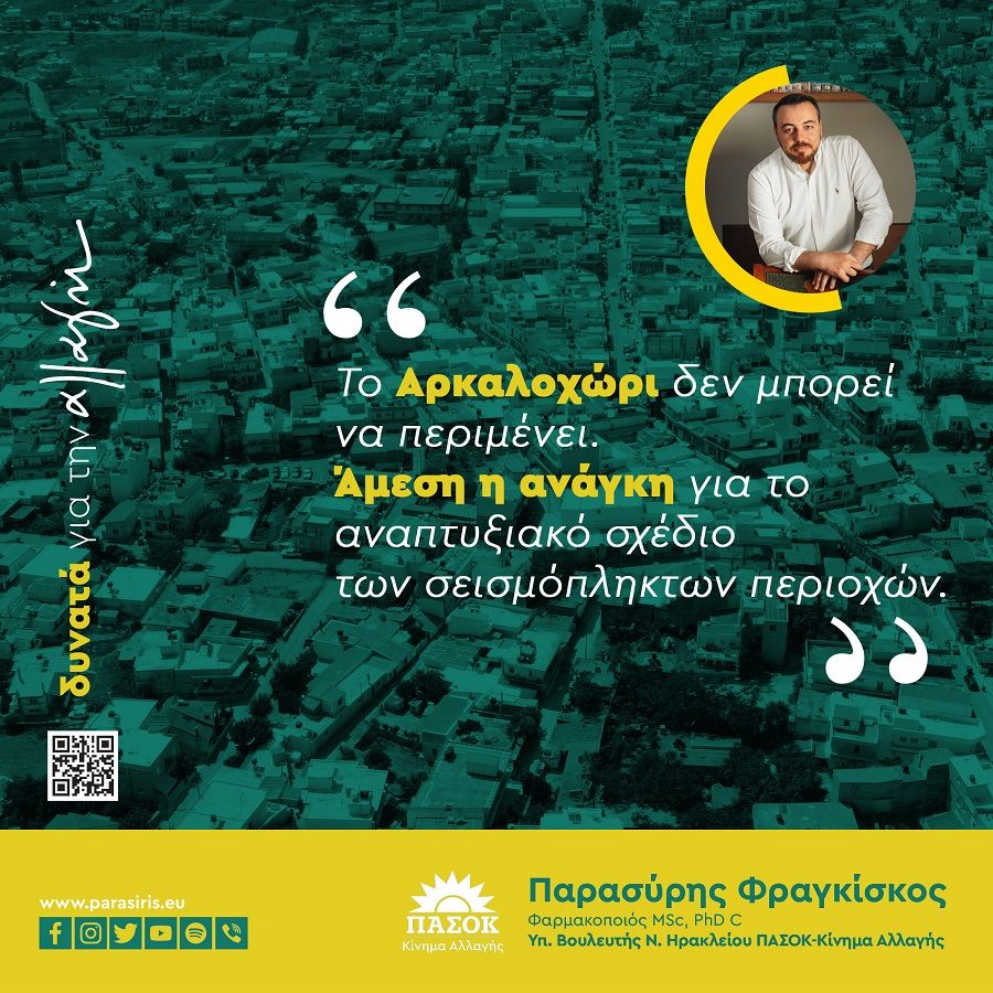 Το Αρκαλοχώρι δεν μπορεί να περιμένει. Ένα ειδικό αναπτυξιακό σχέδιο για τις σεισμόπληκτες εφαρμογές, με ανθρωποκεντρικό χαρακτήρα πρέπει να σχεδιαστεί και να αρχίσει να υλοποιείται άμεσα, τονίζει ο Φραγκίσκος Παρασύρης Υπ. Βουλευτής του ΠΑΣΟΚ-Κίνημα Αλλαγής.