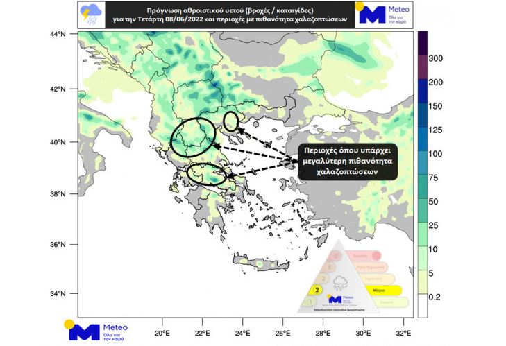 Τις μεσημεριανές και απογευματινές ώρες, υπάρχει μεγάλη πιθανότητα χαλαζοπτώσεων σε περιοχές των κεντρικών και βορείων ηπειρωτικών και ιδιαίτερα στην Πίνδο, στην Κεντρική Στερεά, στα βόρεια τμήματα της Θεσσαλίας και στην Κεντρική και Δυτική Μακεδονία.