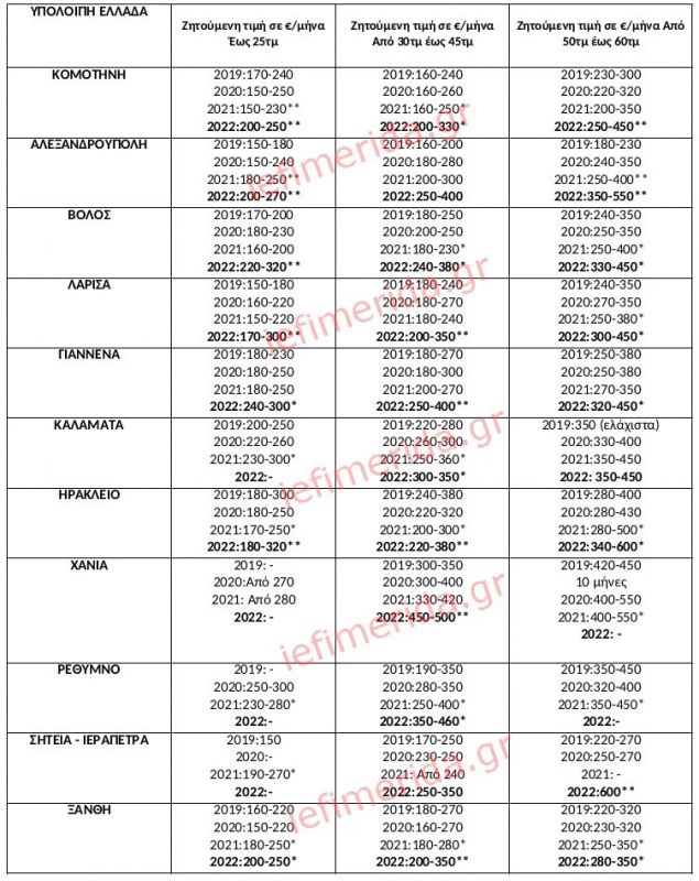 Παράλληλα, για κατοικία 50τμ-60τμ στην ίδια περιοχή, το ζητούμενο μίσθωμα κυμαίνεται από 300€/μήνα έως 450€/μήνα αν πρόκειται για κατοικία ανακαινισμένη ή νεόδμητη, όταν το 2021 το ζητούμενο μίσθωμα ήταν από 250€/μήνα έως 380€/μήνα. Η αύξηση του ζητούμενου μισθώματος κυμαίνεται από 20% στη κατώτατη τιμή έως και 18,4% στην ανώτατη τιμή.