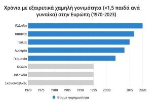 Συνολικά, η Ελλάδα παραμένει στο χαμηλότερο επίπεδο γονιμότητας στην Ευρώπη, με την απουσία στοχευμένων πολιτικών να αποτελεί καθοριστικό παράγοντα, ενώ η γήρανση του πληθυσμού συνεχίζεται με ανησυχητικούς ρυθμούς.