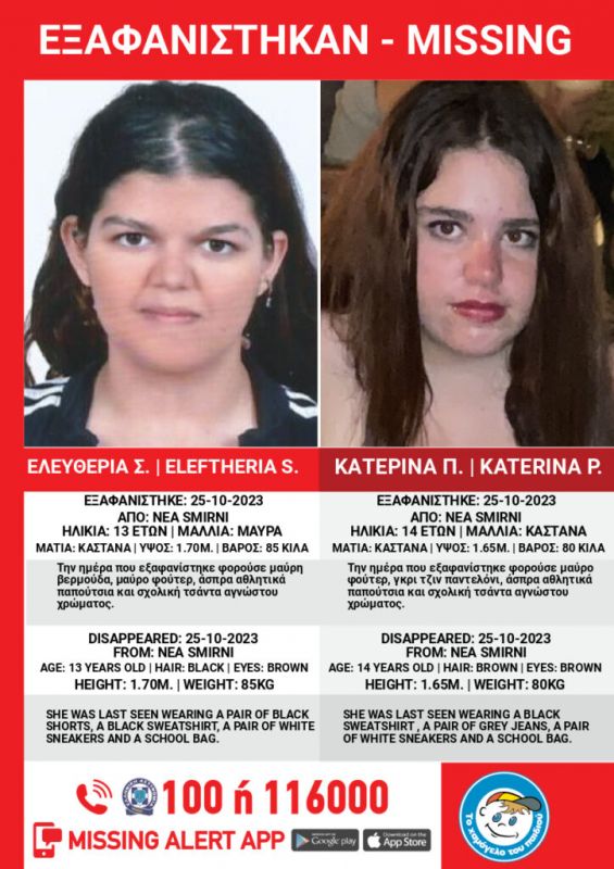 Στις 25/10/2023, μεσημεριανές ώρες, εξαφανίστηκαν από τη Μονάδα Κοινωνικής Φροντίδας Παιδόπολη «Αγία Βαρβάρα», στην περιοχή της Νέας Σμύρνης, Αττικής, η Ελευθερία Σ., 13 ετών και η Αικατερίνη Π., 14 ετών. Το «Χαμόγελο του Παιδιού» ενημερώθηκε σήμερα, 26/10/2023, και άμεσα προχώρησε στη δημοσιοποίηση των στοιχείων των ανήλικων κοριτσιών, κατόπιν εισαγγελικής εντολής, καθώς συντρέχουν λόγοι που θέτουν τη ζωή τους σε κίνδυνο .