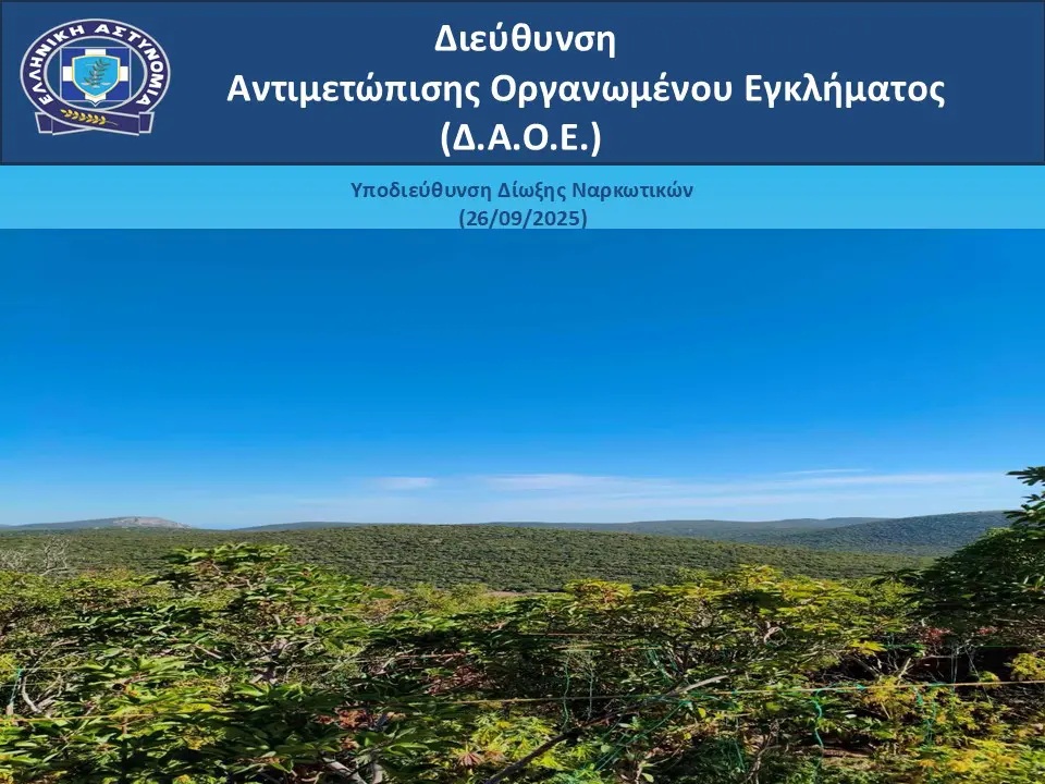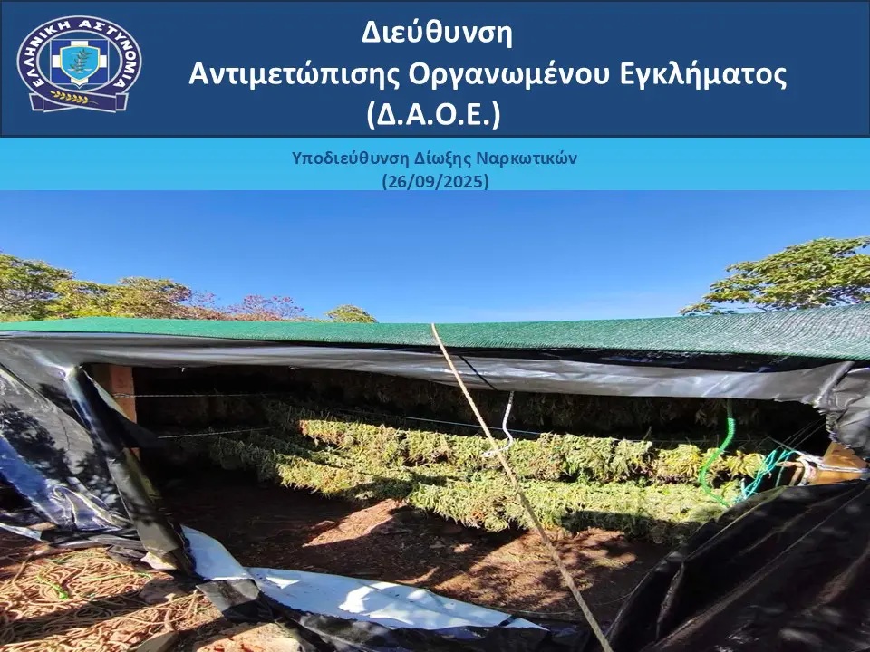 Από τη Διεύθυνση Αντιμετώπισης Οργανωμένου Εγκλήματος εξαρθρώθηκε εγκληματική οργάνωση, τα μέλη της οποίας δραστηριοποιούνταν στην καλλιέργεια δενδρυλλίων κάνναβης με την εγκατάσταση πλήρως εξοπλισμένης φυτείας, καθώς και στη διακίνηση σημαντικών ποσοτήτων ακατέργαστης κάνναβης, σε διάφορες περιοχές της Αττικής και της Αρκαδίας.