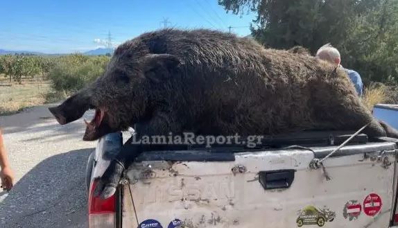 Όπως φαίνεται και στη φωτογραφία του lamiareport.gr, το αγριογούρουνο που πέτυχαν οι κυνηγοί στη Φθιώτιδα εξέχει από την καρότσα του αγροτικού όπου φορτώθηκε.
