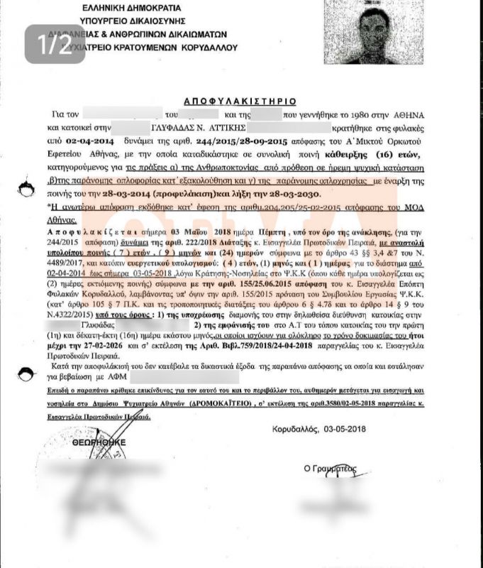 Σύμφωνα με το αποφυλακιστήριό του, ο 46χρονος, σήμερα, δράστης, είχε βγει από το Ψυχιατρείο Κρατουμένων Κορυδαλλού στις 3 Μαΐου του 2018, κάνοντας χρήση των διατάξεων του λεγόμενου νόμου Παρασκευόπουλου και της τελευταίας τροποποίησής του, που προέβλεπε τη δυνατότητα αποφυλάκισης κρατουμένων, οι οποίοι είχαν εκτίσει το ήμισυ της ποινής τους με ευεργετικό υπολογισμό.