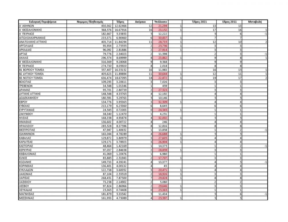 Στον αντίποδα οι έδρες αυτές θα αφαιρεθούν από την Α΄Πειραιά, τις Σέρρες, τη Φθιώτιδα, τη Μαγνησία, την Κοζάνη, την Άρτα, καθώς και την Καστοριά και τη Θεσπρωτία που γίνουμε πλέον μονοεδρικές περιφέρειες.