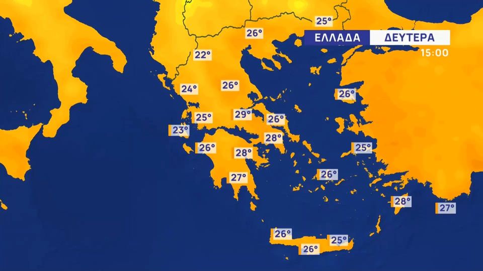 Τη Δευτέρα ο καιρός θα είναι γενικά αίθριος με λίγες τοπικές βροχές σε Ιόνιο, Κρήτη και ανατολικό Αιγαίο, ενώ οι θερμοκρασίες θα κυμαίνονται από 24-29 βαθμούς Κελσίου. Στην Αττική και τη Θεσσαλονίκη ο καιρός θα παραμείνει αίθριος, με ελαφρείς ανέμους και θερμοκρασίες που θα φτάσουν τους 28 βαθμούς στην Αττική και 26 στη Θεσσαλονίκη.