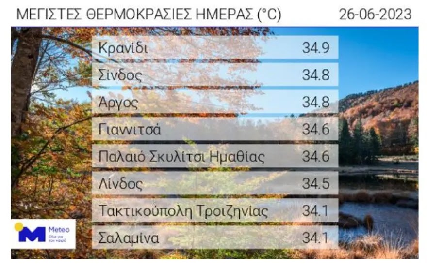 Θερμοκρασία: Από 17 έως 32 βαθμούς Κελσίου. Στη δυτική Μακεδονία 2 με 3 βαθμούς χαμηλότερη.