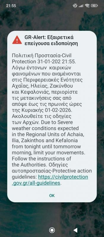 «Λόγω έντονων καιρικών φαινομένων που αναμένονται στις Περιφερειακές Ενότητες Αχαΐας, Ηλείας, Ζακύνθου, Κεφαλονιάς περιορίστε τις μετακινήσεις σας από απόψε έως τις πρωινές ώρες της Κυριακής. Ακολουθείτε τις οδηγίες των Αρχών», αναφέρει το μήνυμα.