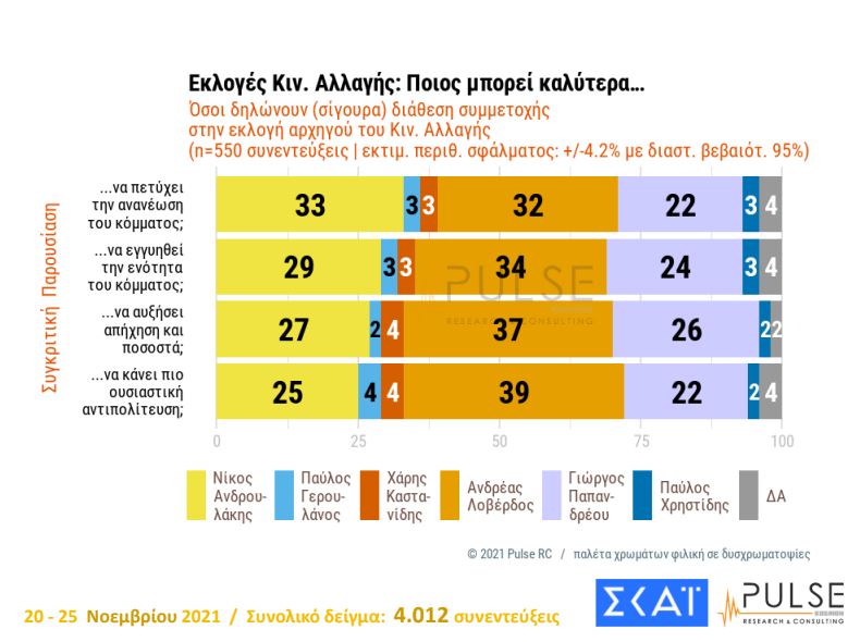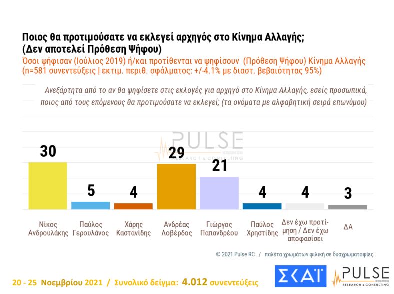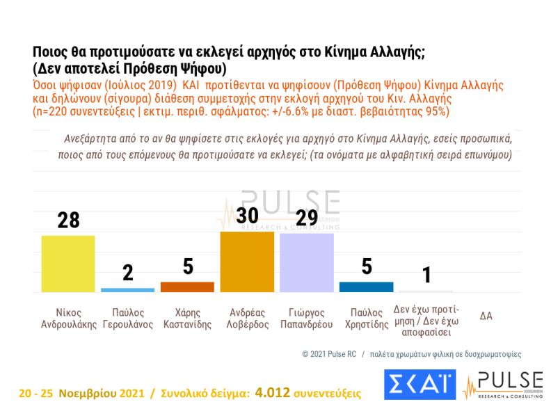 Αντίστοιχα, από τους συμμετέχοντες στην έρευνα που δήλωσαν ότι ψήφισαν Κίνημα Αλλαγής τον Ιούλιο του 2019 ή/και προτίθενται να ψηφίσουν, και επιδεικνύουν διάθεση συμμετοχής στην ανάδειξη νέου αρχηγού, το 30% δίνει ψήφο εμπιστοσύνης στον Ανδρέα Λοβέρδο, το 29% στον Νίκο Ανδρουλάκη, το 27% στον Γιώργο Παπανδρέου, το 5% στον Παύλο Χρηστίδη, το 4% στον Παύλο Γερουλάνο και το 3% στον Χάρη Καστανίδη.