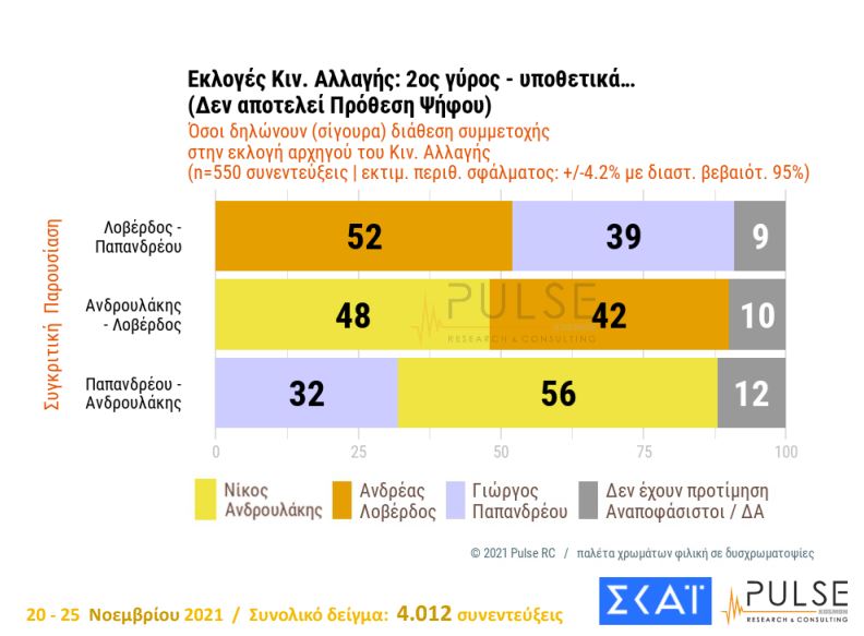 Σε περίπτωση που στον 2ο γύρο περάσουν Νίκος Ανδρουλάκης-Ανδρέας Λοβέρδος, νικητής αναδεικνύεται ο Νίκος Ανδρουλάκης με 48% κι έπεται ο Λοβέρδος με 42%.