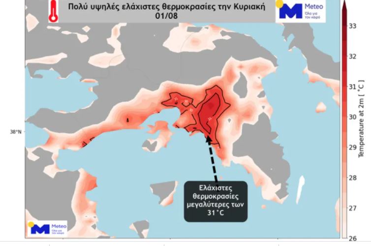 Στον προγνωστικό χάρτη που ακολουθεί αποτυπώνονται οι ελάχιστες θερμοκρασίες για την Κυριακή 01/08, με τη θερμοκρασία εντός του αστικού ιστού της Αθήνας να διατηρείται στα επίπεδα των 30-32 βαθμών Κελσίου.