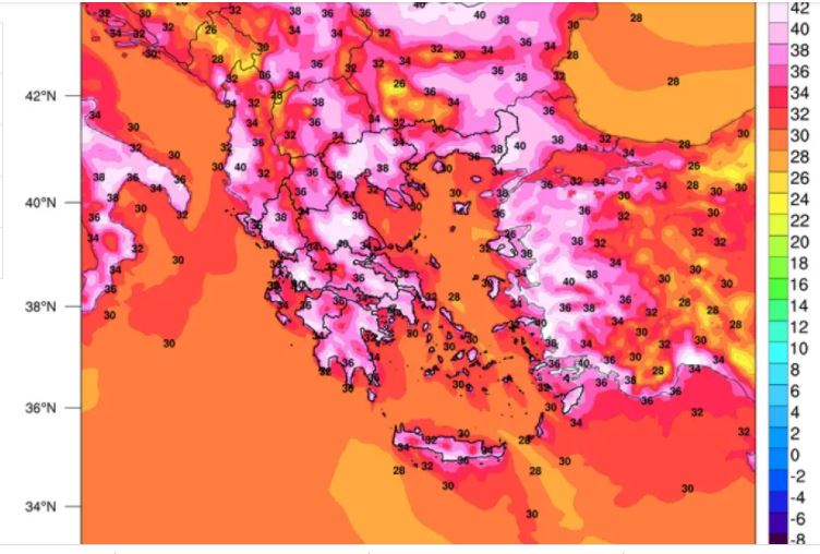 Με βάση τα προγνωστικά στοιχεία του μέγιστες θερμοκρασίες της τάξης των 42-44 βαθμών Κελσίου αναμένονται σήμερα και την Κυριακή ενώ περαιτέρω αισθητή άνοδο θα σημειώσει η θερμοκρασία τη νέα εβδομάδα.