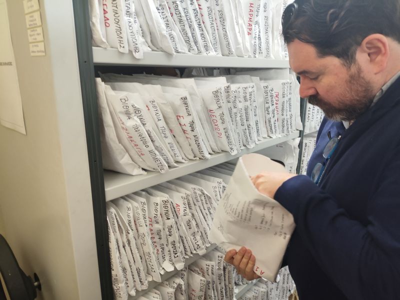 Ο ιστορικός Δημήτρης Καμούζης, επικεφαλής της ερευνητικής ομάδας του ΚΜΣ μας ξενάγησε στις αρχειακές συλλογές του
