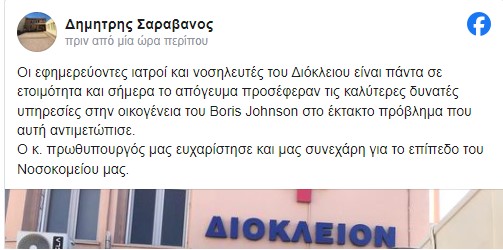Ο διοικητής του νοσοκομείου προχώρησε σε ανάρτηση τονίζοντας: «Οι εφημερεύοντες ιατροί και νοσηλευτές του Διόκλειου είναι πάντα σε ετοιμότητα και σήμερα το απόγευμα προσέφεραν τις καλύτερες δυνατές υπηρεσίες στην οικογένεια του Boris Johnson στο έκτακτο πρόβλημα που αυτή αντιμετώπισε. Ο κ. πρωθυπουργός μας ευχαρίστησε και μας συνεχάρη για το επίπεδο του Νοσοκομείου μας».