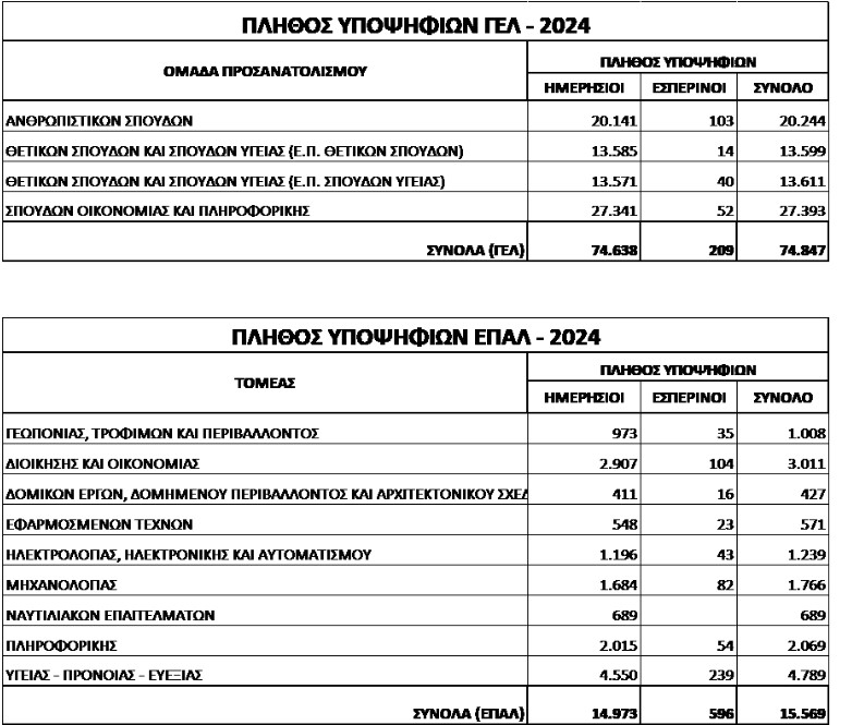 Β. ΠΛΗΘΟΣ ΥΠΟΨΗΦΙΩΝ: Οι υποψήφιοι που συμμετείχαν στις Πανελλαδικές Εξετάσεις έτους 2024 ανά είδος Λυκείου και Ομάδα Προσανατολισμού/Τομέα εμφανίζονται στους παρακάτω πίνακες: