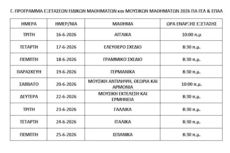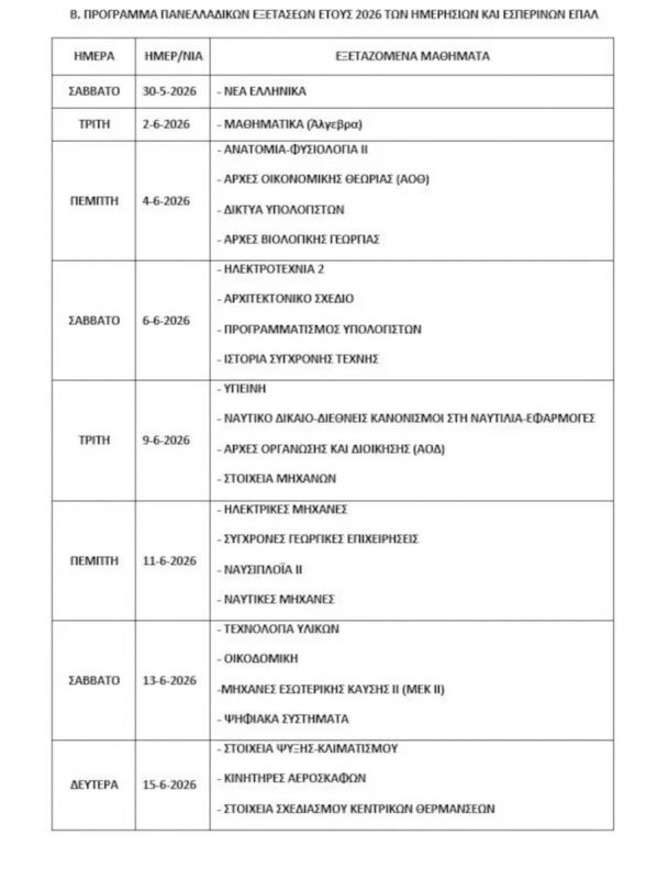 Οι Πανελλήνιες 2026 για τα ημερήσια και τα εσπερινά ΕΠΑΛ ξεκινούν το Σάββατο 30 Μαΐου με το μάθημα των Νέων Ελληνικών και συνεχίζονται την Τρίτη 2 Ιουνίου με τα Μαθηματικά (Άλγεβρα).