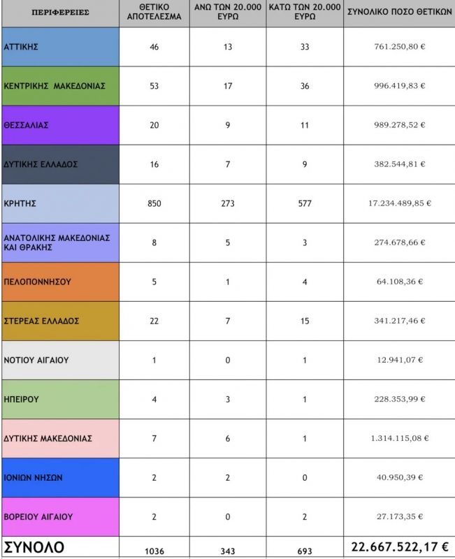 Όπως φαίνεται και από τον παρακάτω χάρτη με τα ΑΦΜ που εντοπίστηκαν να έχουν λάβει παράνομες επιδοτήσεις, τα περισσότερα είναι στην Κρήτη. Συγκεκριμένα, στο νησί βρέθηκαν συνολικά 850 «αμαρτωλά» ΑΦΜ. Τα 273 αφορούν ποσά επιδοτήσεων άνω των 20.000 ευρώ, και 577 αφορούν ποσά κάτω των 20.000 ευρώ. Συνολικά το ποσό φτάνει τα 17.234.489,85 ευρώ, από το σύνολο των 22.667.522,17 ευρώ.