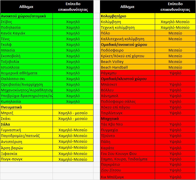 - μία φορά κάθε εβδομάδα για τα αθλήματα επιπέδου επικινδυνότητας «υψηλού».