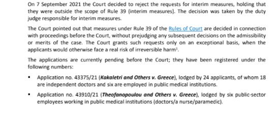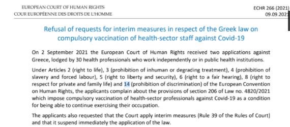 Το ευρωπαϊκό δικαστήριο δικαιωμάτων του ανθρώπου απέρριψε αιτήματα προσωρινής δικαστικής προστασίας που υπέβαλαν Ελληνες υγειονομικοί κατά του υποχρεωτικού εμβολιασμού.