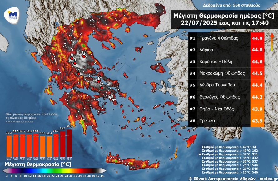 Σύμφωνα με το δίκτυο αυτόματων μετεωρολογικών σταθμών του Εθνικού Αστεροσκοπείου Αθηνών / meteo.gr, για ακόμα μία ημέρα οι υψηλότερες θερμοκρασίες της επικράτειας σημειώθηκαν στη Θεσσαλία και στην Ανατολική Στερεά, όπου πλησίασαν τους 45 °C.