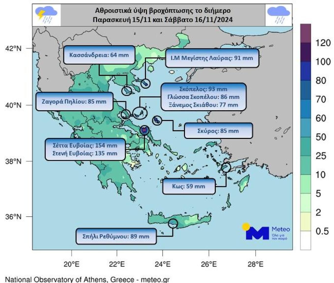 Σε συμφωνία με τα προγνωστικά δεδομένα σημαντικές βροχοπτώσεις σημειώθηκαν το διήμερο Παρασκευή 15/11 και Σάββατο 16/11/2024, στην Εύβοια, στις Σποράδες, στη Μαγνησία, στη Νότια Χαλκιδική και σε τμήματα του Ανατολικού Αιγαίου, των Δωδεκανήσων και της Κρήτης.