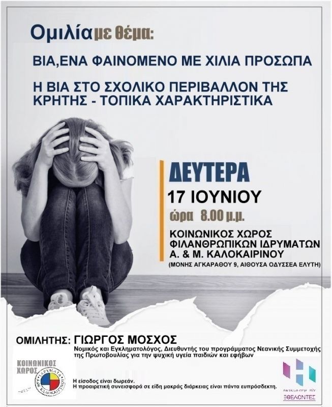 Η Ομάδα Κοινωνικής Αλληλεγγύης των Εθελοντών της παράταξης «Δικαίωμα στην Πόλη» δίνει βήμα για δημόσιο διάλογο τη Δευτέρα 17 Ιουνίου 2024 και ώρα 8:00 μ.μ., στον Κοινωνικό Χώρο των Ιδρυμάτων Α. και Μ. Καλοκαιρινού με θέμα «Βία, ένα φαινόμενο με χίλια πρόσωπα. Η βία στο σχολικό περιβάλλον της Κρήτης - Τοπικά χαρακτηριστικά».