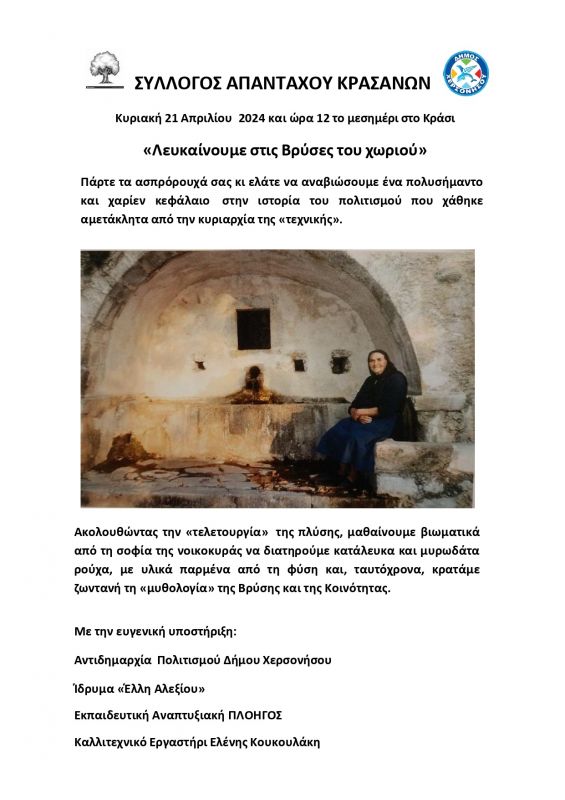Εκδήλωση με θέμα: «Λευκαίνουμε στις Βρύσες του χωριού» πραγματοποιεί αυτή την Κυριακή 21 Απριλίου και ώρα 12 το μεσημέρι ο Σύλλογος Απανταχού Κρασανών – που καταστατικό σκοπό του έχει την προστασία και ανάδειξη της φυσικής και πολιτιστικής κληρονομιάς του τόπου – με την υποστήριξη του Δήμου Χερσονήσου/Αντιδημαρχία Πολιτισμού, του Δημοτικού Ιδρύματος «΄ΕΛΛΗ ΑΛΕΞΙΟΥ», της Εκπαιδευτικής Αναπτυξιακής «Πλοηγός» και του Καλλιτεχνικού Εργαστηρίου Ελένης Κουκουλάκη.