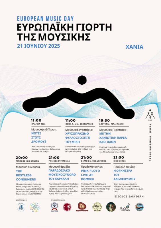Ο Δήμος Χανίων συμμετέχει όπως κάθε χρόνο στην Ευρωπαϊκή Γιορτή της Μουσικής, η οποία θα εορταστεί επίσημα το Σάββατο 21 Ιουνίου. Η Ευρωπαϊκή Γιορτή της Μουσικής τελεί υπό την Αιγίδα του Υπουργείου Πολιτισμού & Αθλητισμού.