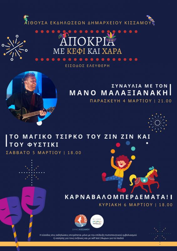 Με δεδομένο ότι οι καρναβαλικές παρελάσεις δεν επιτρέπονται φέτος, ο Δήμος Κισσάμου και η Κοινωφελής Επιχείρηση αποφάσισε την πραγματοποίηση μιας σειράς εκδηλώσεων για το τριήμερο της Αποκριάς στην αίθουσα του Δημαρχείου που σκοπό έχουν να προσφέρουν χαρά, ψυχαγωγία και χαμόγελο σε μικρούς και μεγάλους, κάτι που όλοι έχουμε ανάγκη έπειτα από δύο χρόνια περιορισμών και υγειονομικής κρίσης, τηρώντας όλα τα ισχύοντα υγειονομικά πρωτόκολλα.