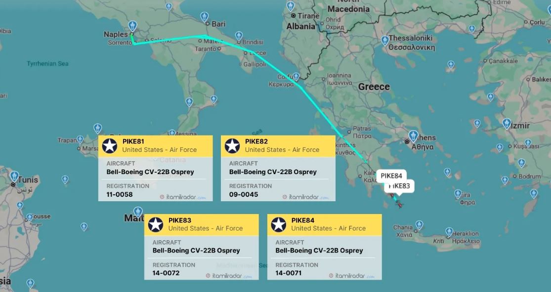 Όπως αναφέρει το itamilradar.com τα αεροσκάφη καθέτου απογειώσεως με διακριτικά κλήσης PIKE81, PIKE82, PIKE83 και PIKE84 διέσχισαν τη νότια Ιταλία πριν συνεχίσουν προς την Ελλάδα.