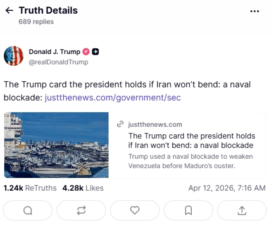 ετά το αδιέξοδο στις συνομιλίες ΗΠΑ–Ιράν στο Ισλαμαμπάντ, ο πρόεδρος των ΗΠΑ Ντόναλντ Τραμπ ανήρτησε στην πλατφόρμα Truth Social άρθρο στο οποίο γίνεται αναφορά στο ενδεχόμενο επιβολής ναυτικού αποκλεισμού στο Ιράν, εφόσον η Τεχεράνη δεν αποδεχθεί τις αμερικανικές απαιτήσεις.
