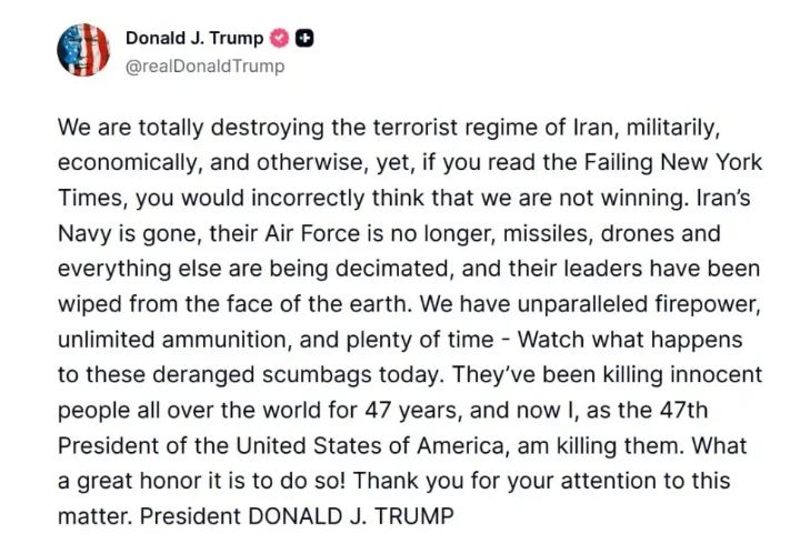 «Καταστρέφουμε εντελώς το τρομοκρατικό καθεστώς του Ιράν, στρατιωτικά, οικονομικά και με άλλους τρόπους, αλλά αν διαβάσετε την αποτυχημένη εφημερίδα New York Times, θα νομίζετε λανθασμένα ότι δεν κερδίζουμε. Το ναυτικό του Ιράν έχει εξαφανιστεί, η αεροπορία του δεν υπάρχει πια, οι πύραυλοι, τα drones και όλα τα άλλα έχουν καταστραφεί, και οι ηγέτες του έχουν εξαφανιστεί από προσώπου γης.