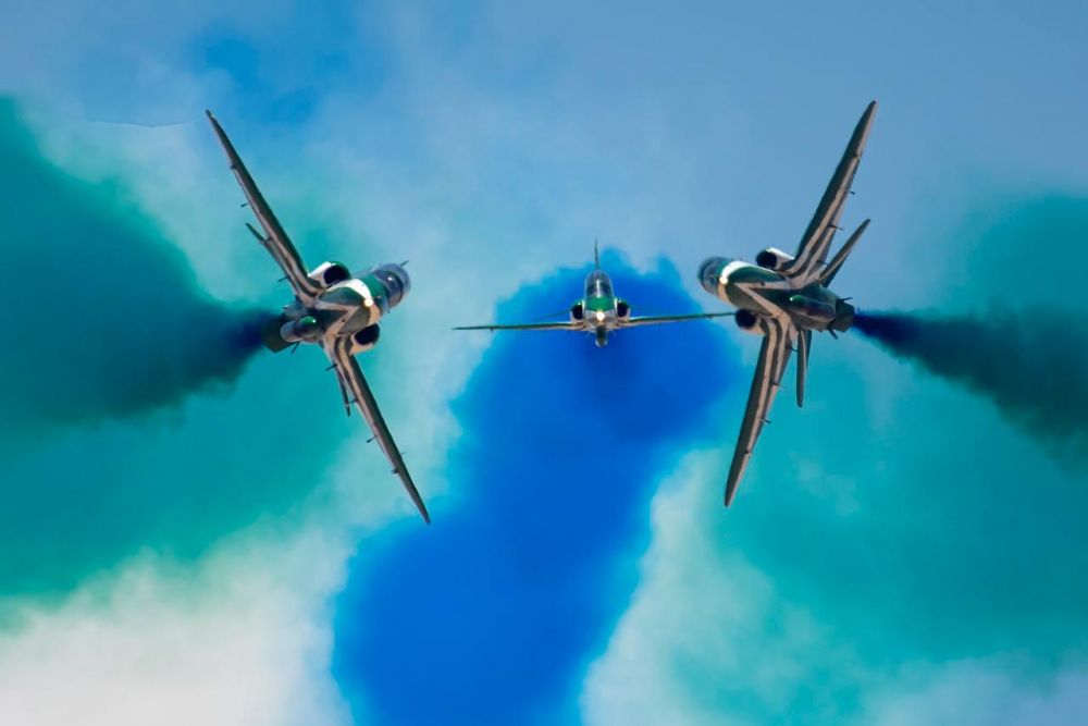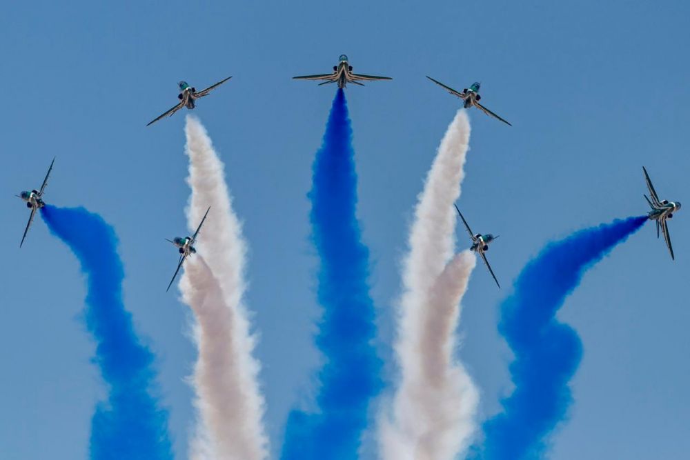 Ακολούθως έλαβε χώρα αεροπορική επίδειξη, κατά την οποία εκτελέστηκαν χαμηλές διελεύσεις μικτού σχηματισμού μαχητικών αεροσκαφών F-16 της Ελληνικής Πολεμικής Αεροπορίας και F-15 της Βασιλικής Αεροπορίας της Σαουδικής Αραβίας, καθώς και Airshow του Ακροβατικού Σμήνους των «Saudi Falcons», κατά το οποίο απεδόθησαν ιδιαίτερες τιμές στην Γαλανόλευκη.