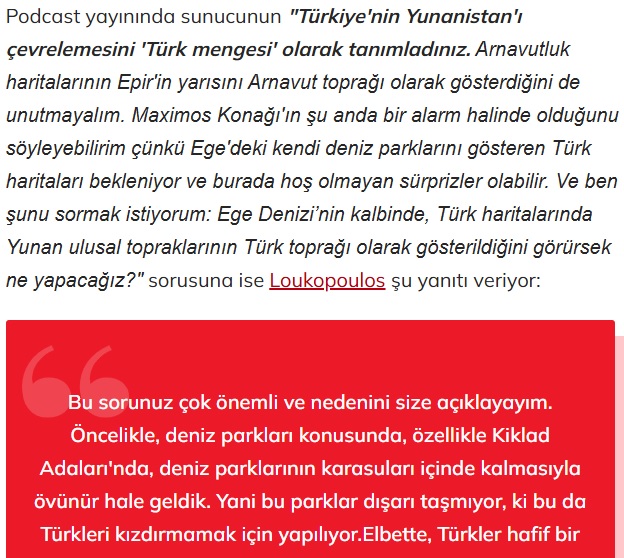 Podcast yayınında sunucunun "Türkiye'nin Yunanistan'ı çevrelemesini 'Türk mengesi' olarak tanımladınız. Arnavutluk haritalarının Epir'in yarısını Arnavut toprağı olarak gösterdiğini de unutmayalım. Maximos Konağı'ın şu anda bir alarm halinde olduğunu söyleyebilirim çünkü Ege'deki kendi deniz parklarını gösteren Türk haritaları bekleniyor ve burada hoş olmayan sürprizler olabilir. Ve ben şunu sormak istiyorum: Ege Denizi’nin kalbinde, Türk haritalarında Yunan ulusal topraklarının Türk toprağı olarak gösterildiğini görürsek ne yapacağız?" sorusuna ise Loukopoulos şu yanıtı veriyor: