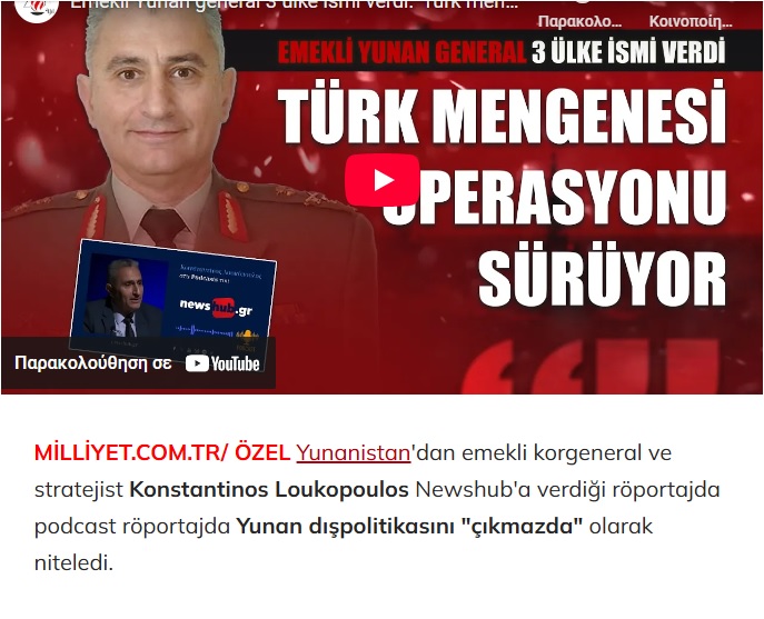 Τελευταία αναφορά, το ειδικό βίντεο της Milliyet, στο εξαιρετικό podcast, με τον (αντιστράτηγο ε.α.) Κωνσταντίνο Λουκόπουλο, που αναφέρεται στην πορεία των εθνικών μας θεμάτων, με επίκεντρο τα Ελληνοτουρκικά.
