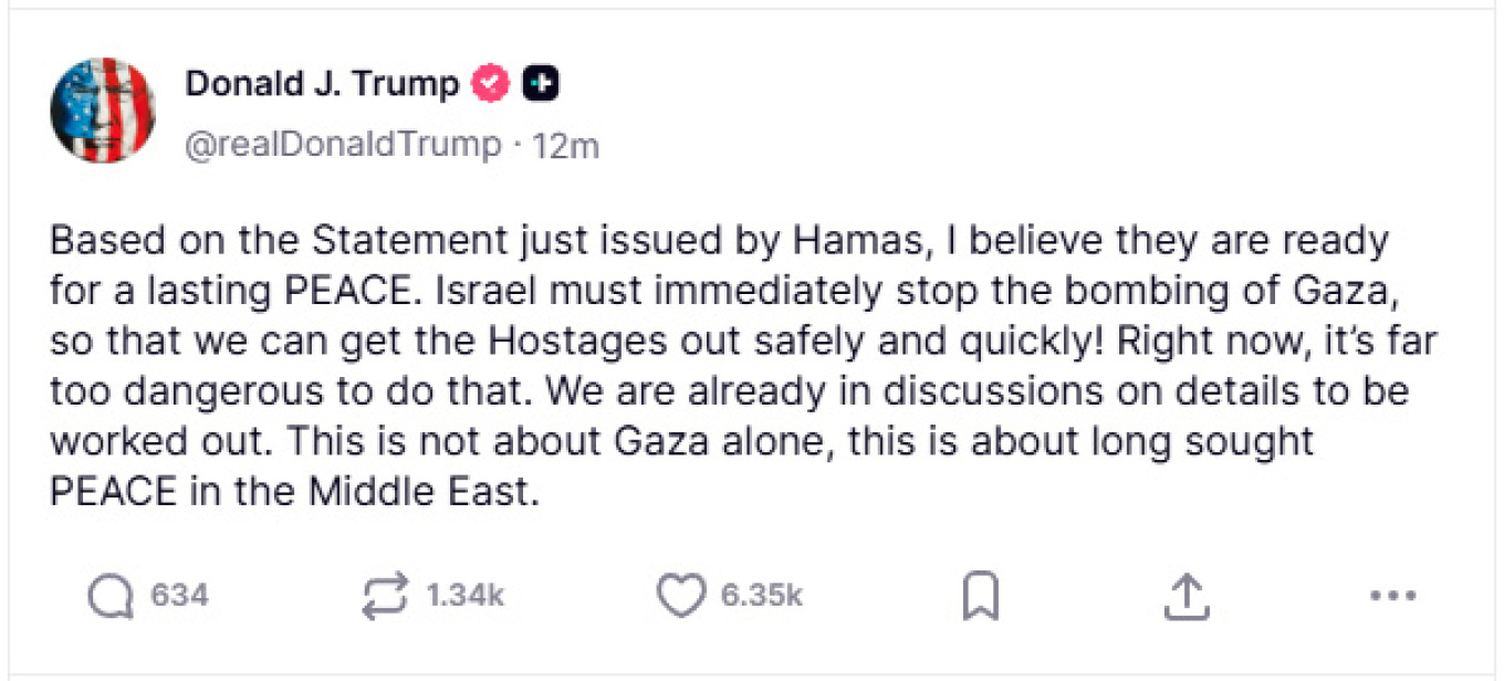 Με ανάρτησή του στο δίκτυό του Truth Social, ο Τραμπ ανέφερε λίγο μετά τα μεσάνυχτα Παρασκευής προς Σάββατο ότι το Ισραήλ πρέπει να «σταματήσει αμέσως τους βομβαρδισμούς στη Λωρίδα της Γάζας» λέγοντας ότι η «Χαμάς είναι έτοιμη για διαρκή ειρήνη» μετά την απάντηση του παλαιστινιακού ισλαμιστικού κινήματος. «Το Ισραήλ πρέπει να σταματήσει αμέσως τους βομβαρδισμούς της Γάζας, ώστε να μπορέσουμε να απελευθερώσουμε τους ομήρους γρήγορα και με ασφάλεια», τόνισε ο Τραμπ περίπου στις 00:15 Σάββατο, ώρα Ελλάδας.
