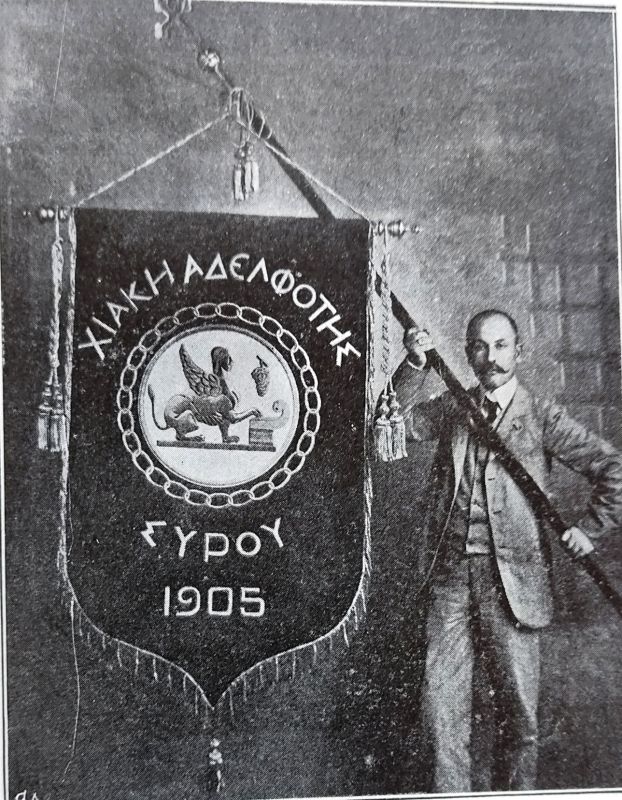 Στο λάβαρο που σηκώνει ο Χ. Γεούργας καταγράφεται η ίδρυση “Χιακής Αδελφότητος” στη Σύρο το 1905.