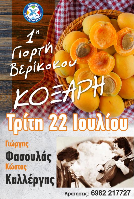 Στο πλαίσιο του 2ου Φεστιβάλ Τεχνών και Πολιτισμού Δήμου Χερσονήσου θα πραγματοποιηθεί η 1η Γιορτή Βερίκοκου, την Τρίτη 22 Ιουλίου και ώρα 21.00 στην Κόξαρη, στον αύλειο χώρο του παλαιού Δημοτικού Σχολείου.