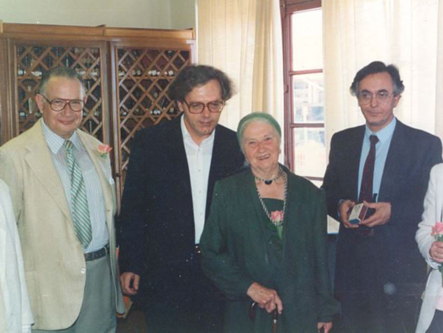 [O Νίκος Γιανναδάκης (δεύτερος από αριστερά), και μαζί του ο Γιώργος Σαββίδης, η Μαρώ Σεφέρη και ο Δημήτρης Δασκαλόπουλος (που συνεχίζει τις εργασίες πνευματικής αλληλεγγύης εκδίδοντας πριν από λίγες μέρες τη Βιβλιογραφία του Μανόλη Αναγνωστάκη).]