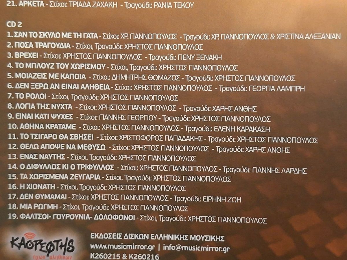 Το πρώτο CD περιέχει τραγούδια από συνεργάτες στιχουργούς που συμμετέχουν σε αυτές τις «Μουσικές Διαδρομές». Το δεύτερο CD που υπάρχει μέσα είναι πολύ Γιαννόπουλος… Δηλαδή έχω μέσα 12 ερμηνείες. Μέσα σε αυτές τις ερμηνείες είναι και ένα δικό σου τραγούδι, δικός σου στίχος δηλαδή»…