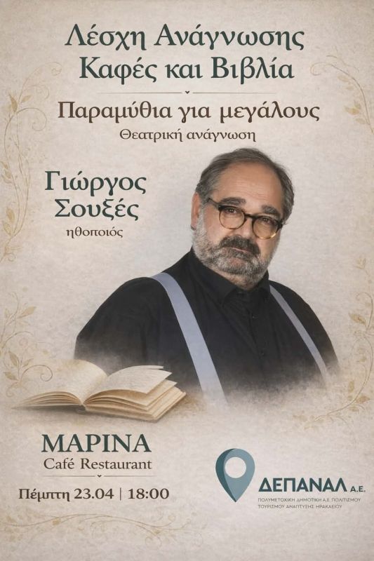 Την Πέμπτη 23 Απριλίου στις 18:00, στο MARINA Café Restaurant, το κοινό θα έχει την ευκαιρία να ταξιδέψει στον κόσμο των παραμυθιών μέσα από μια ιδιαίτερη θεατρική ανάγνωση από τον αγαπημένο ηθοποιό Γιώργο Σουξέ.